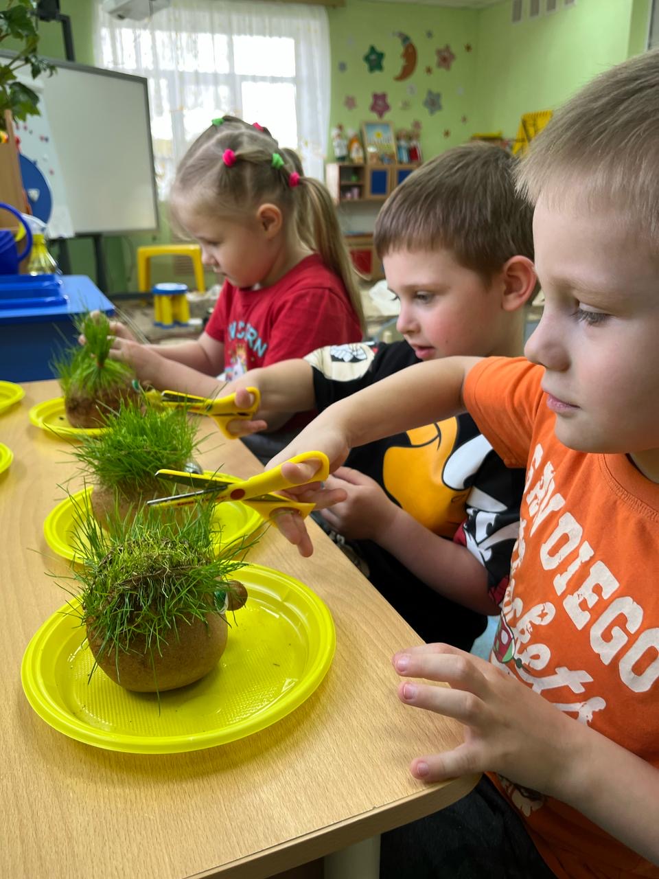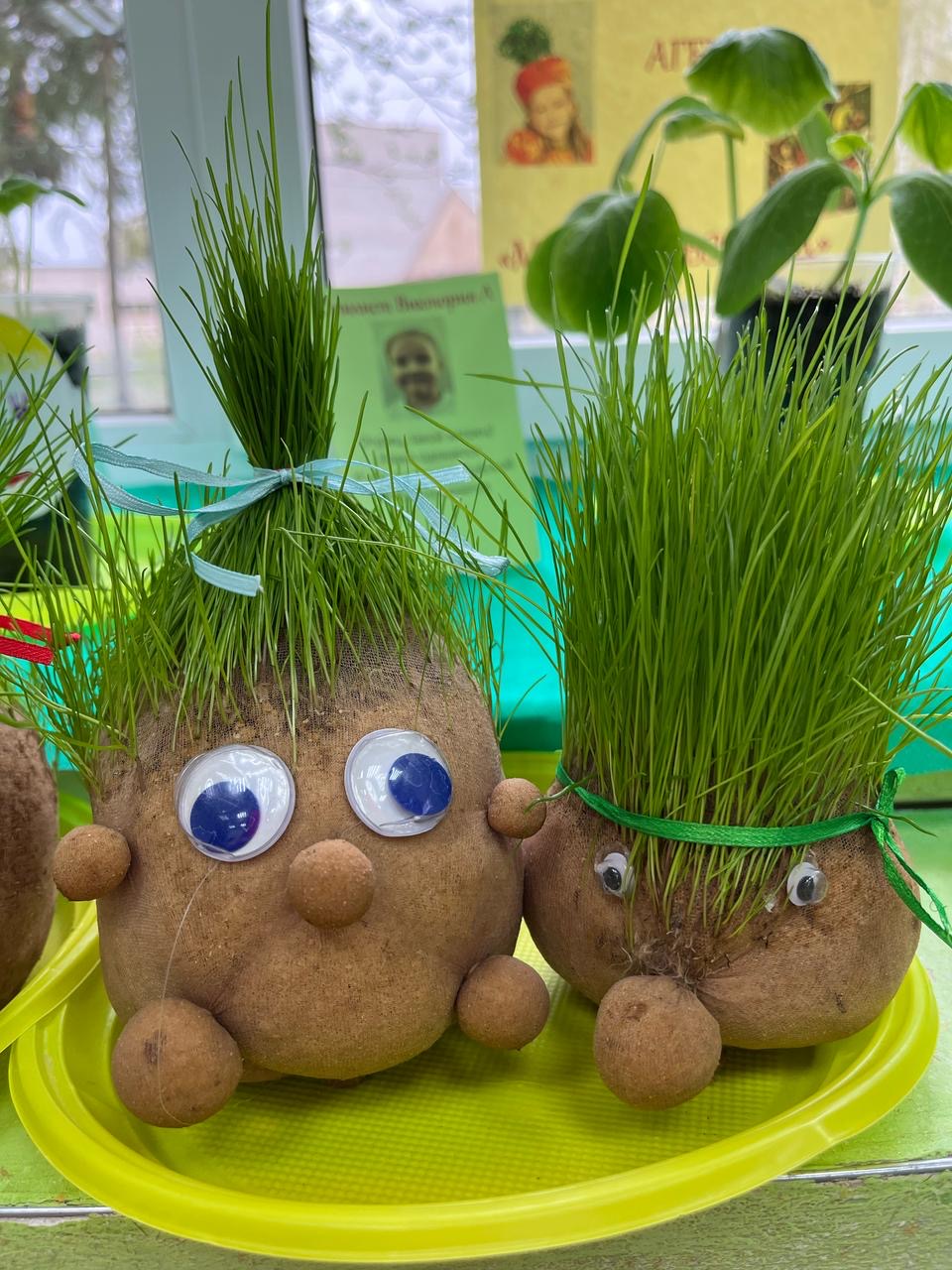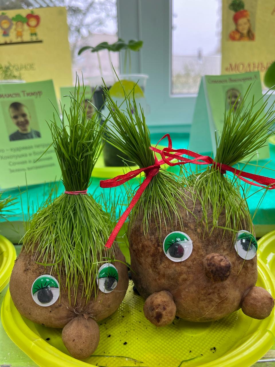 Когда «волосы» «Травянчиков» достаточно подросли, ребята решили создать причёски и на мгновение стать парикмахерами.