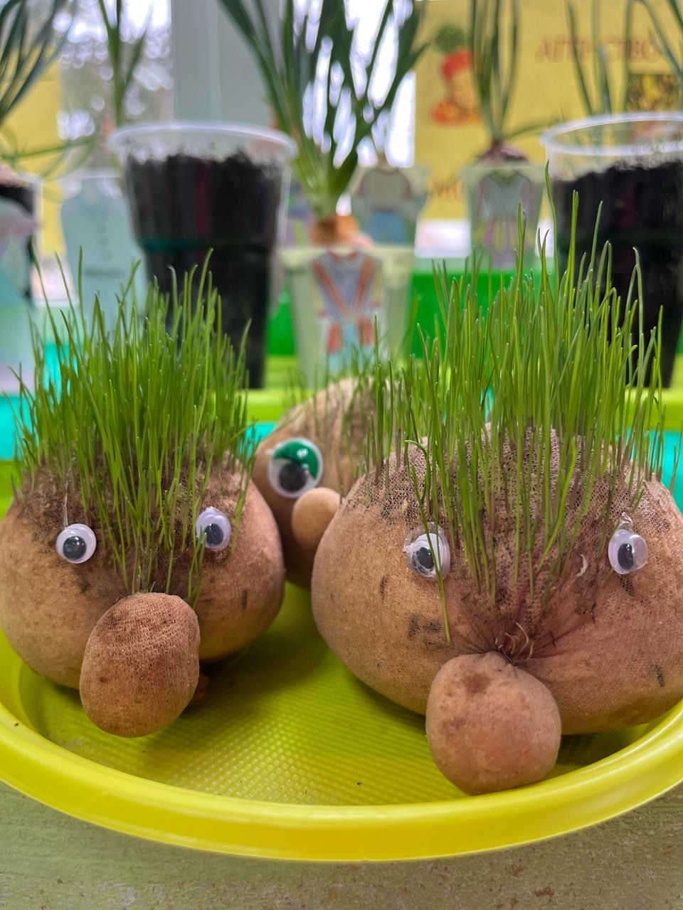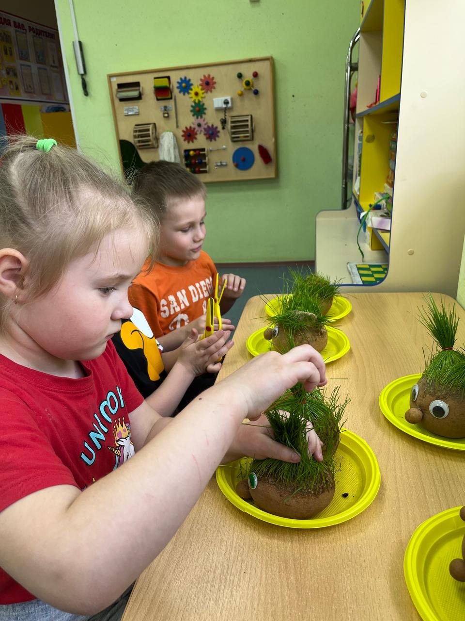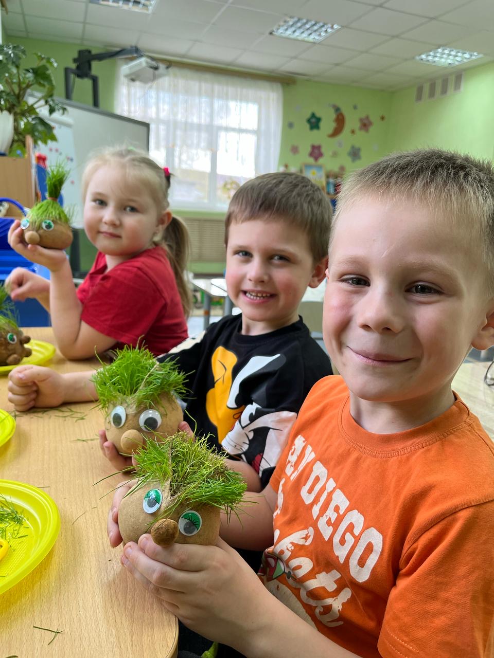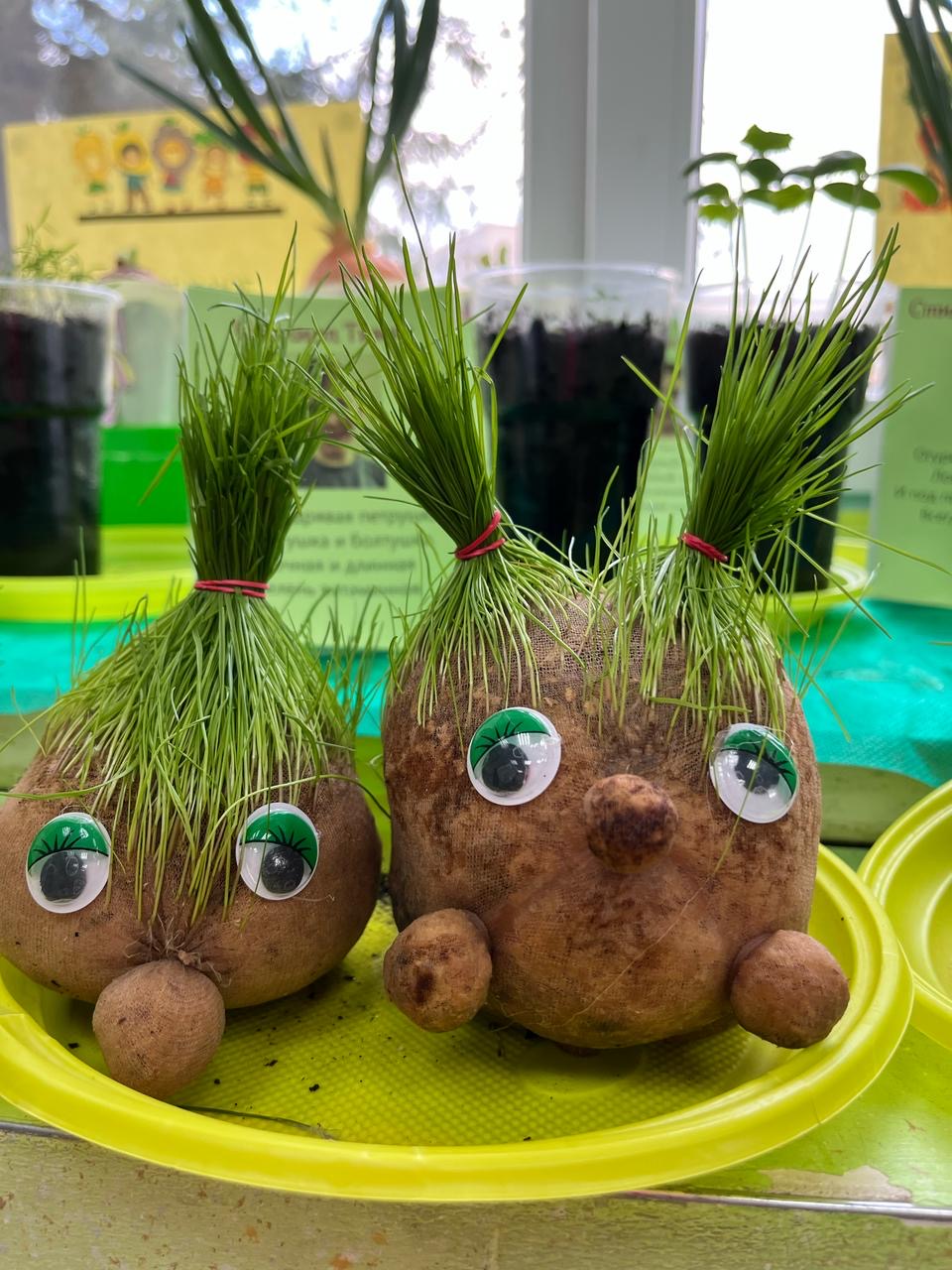 Когда «волосы» «Травянчиков» достаточно подросли, ребята решили создать причёски и на мгновение стать парикмахерами.