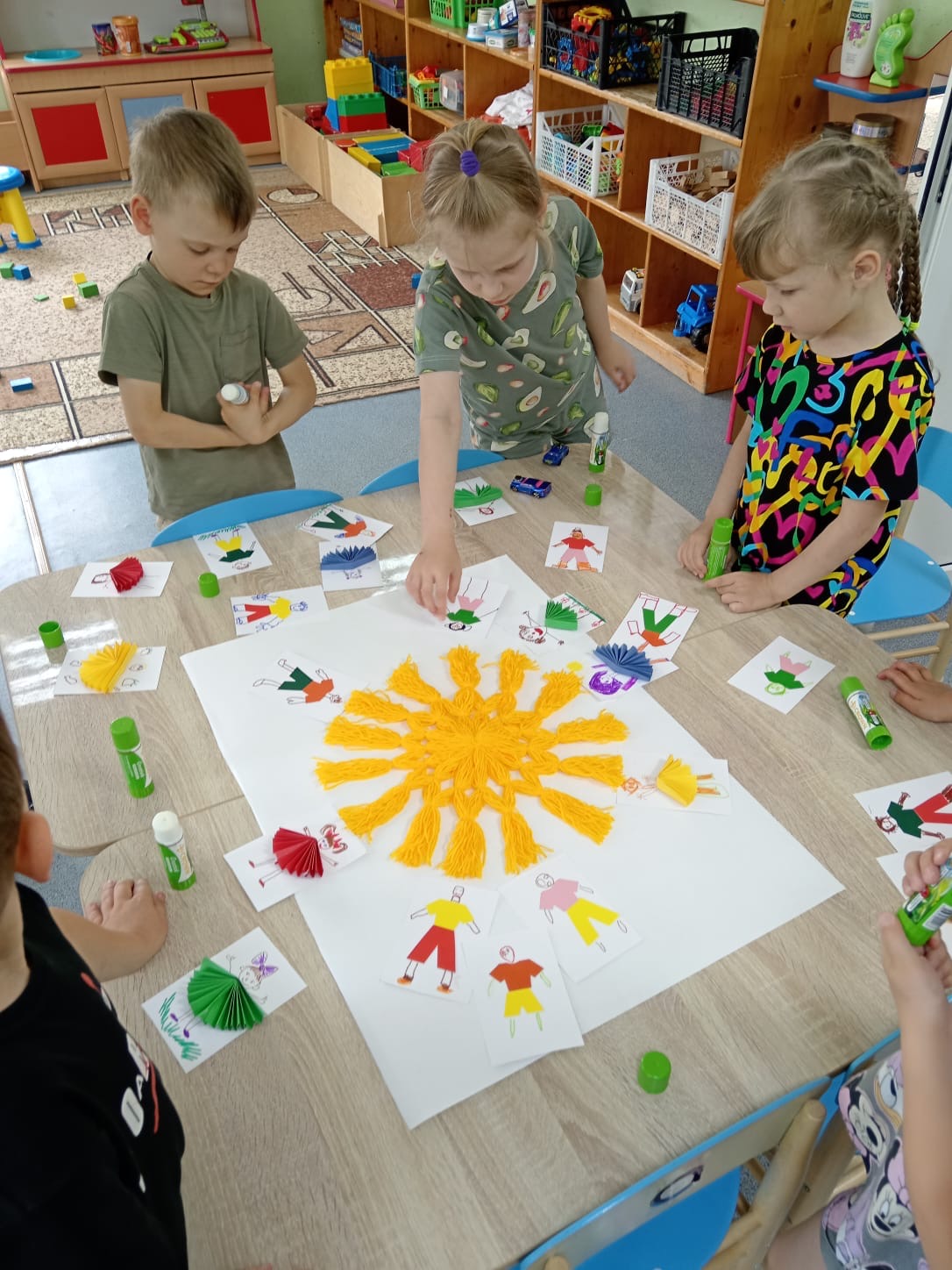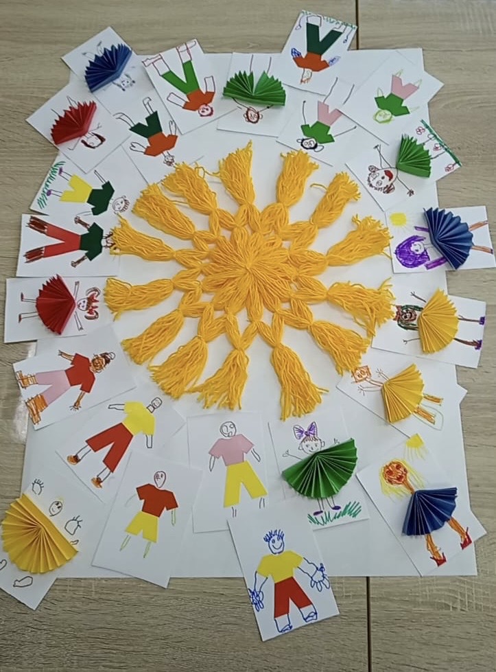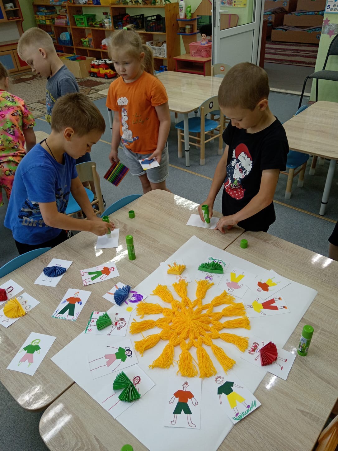 Продолжает работу ЛЕТНЯЯ КАРТИННАЯ ГАЛЕРЕЯ . Воспитанники группы "Звёздочки" вместе с воспитателем Ириной Владимировной своими руками сделали картину с красивым названием "Пусть всегда будет солнце!" В работе ребята использовали цветной картон, бумагу, нитки и фломастеры. В центре картины яркое, тёплое солнце - символ жизни, радости и мира. Делали его все вместе из ниток. Вокруг солнца фигурки детей. С фантазией и старанием ребята клеили и рисовали самих себя. Немного времени и усилий, чуть - чуть аккуратность и весёлая, живая картина готова. Материть картину своими руками было очень интересно и увлекательно. Атмосфера царила творческая и дружелюбная.
