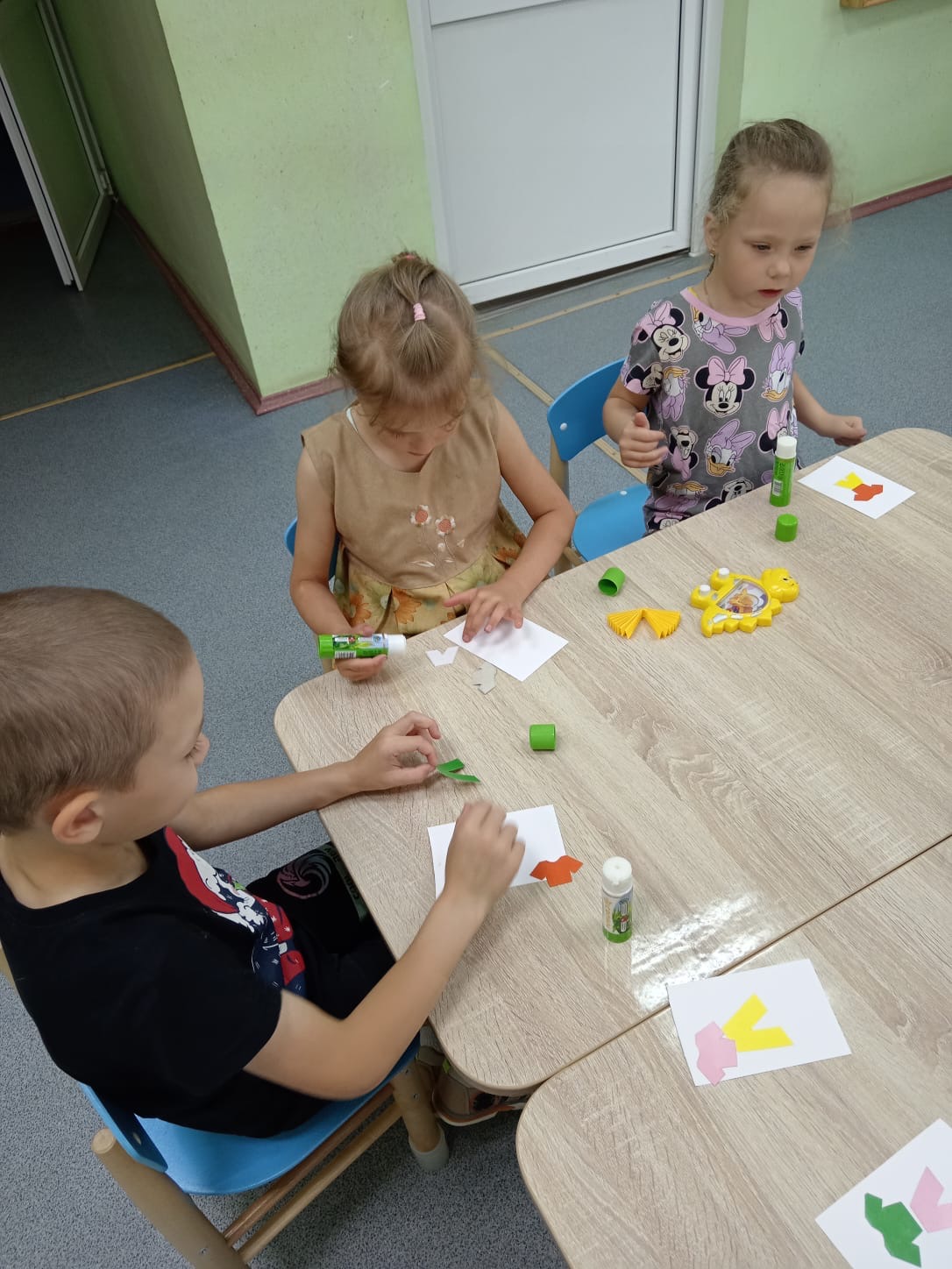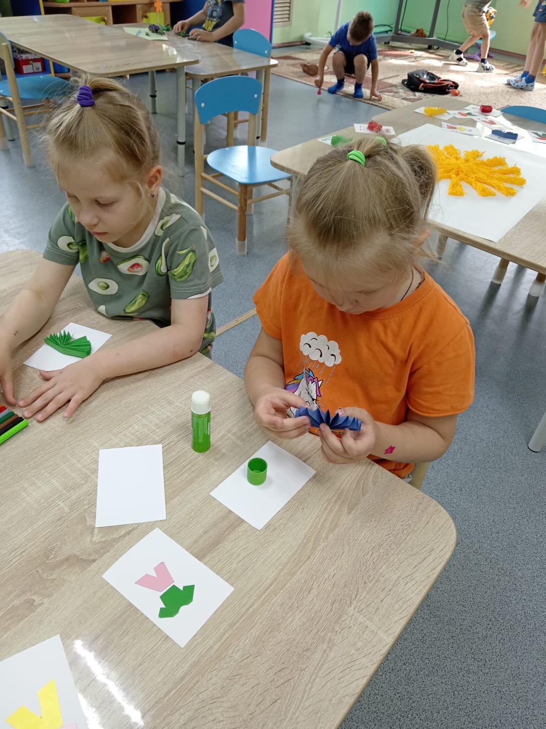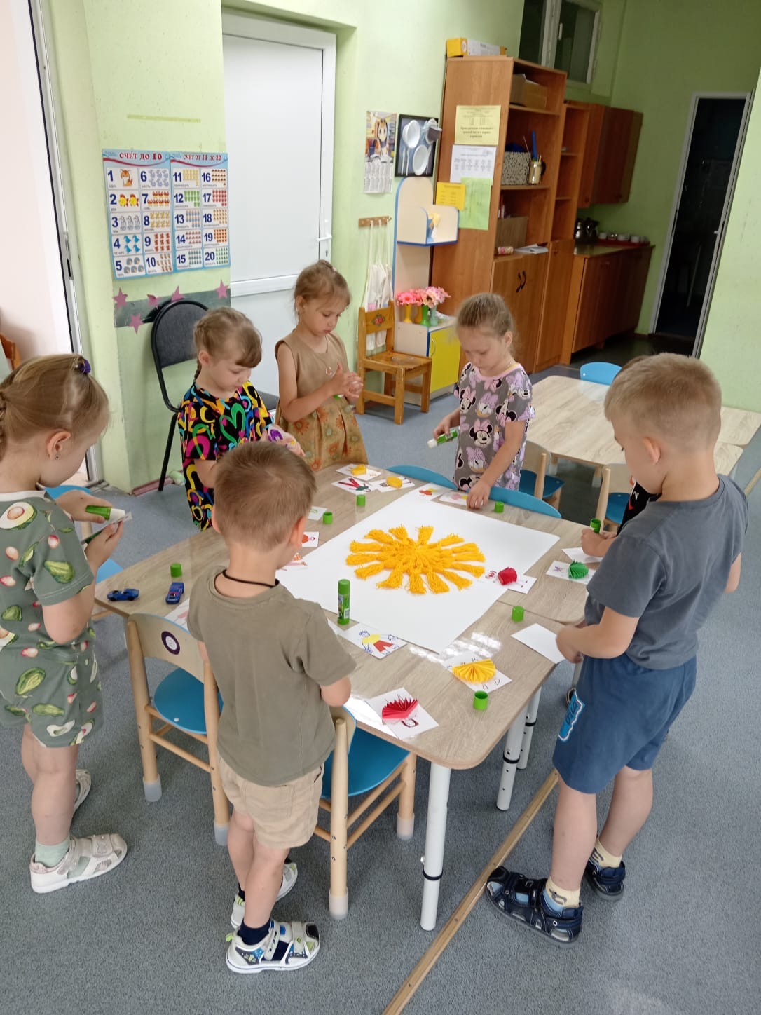 Продолжает работу ЛЕТНЯЯ КАРТИННАЯ ГАЛЕРЕЯ . Воспитанники группы "Звёздочки" вместе с воспитателем Ириной Владимировной своими руками сделали картину с красивым названием "Пусть всегда будет солнце!" В работе ребята использовали цветной картон, бумагу, нитки и фломастеры. В центре картины яркое, тёплое солнце - символ жизни, радости и мира. Делали его все вместе из ниток. Вокруг солнца фигурки детей. С фантазией и старанием ребята клеили и рисовали самих себя. Немного времени и усилий, чуть - чуть аккуратность и весёлая, живая картина готова. Материть картину своими руками было очень интересно и увлекательно. Атмосфера царила творческая и дружелюбная.
