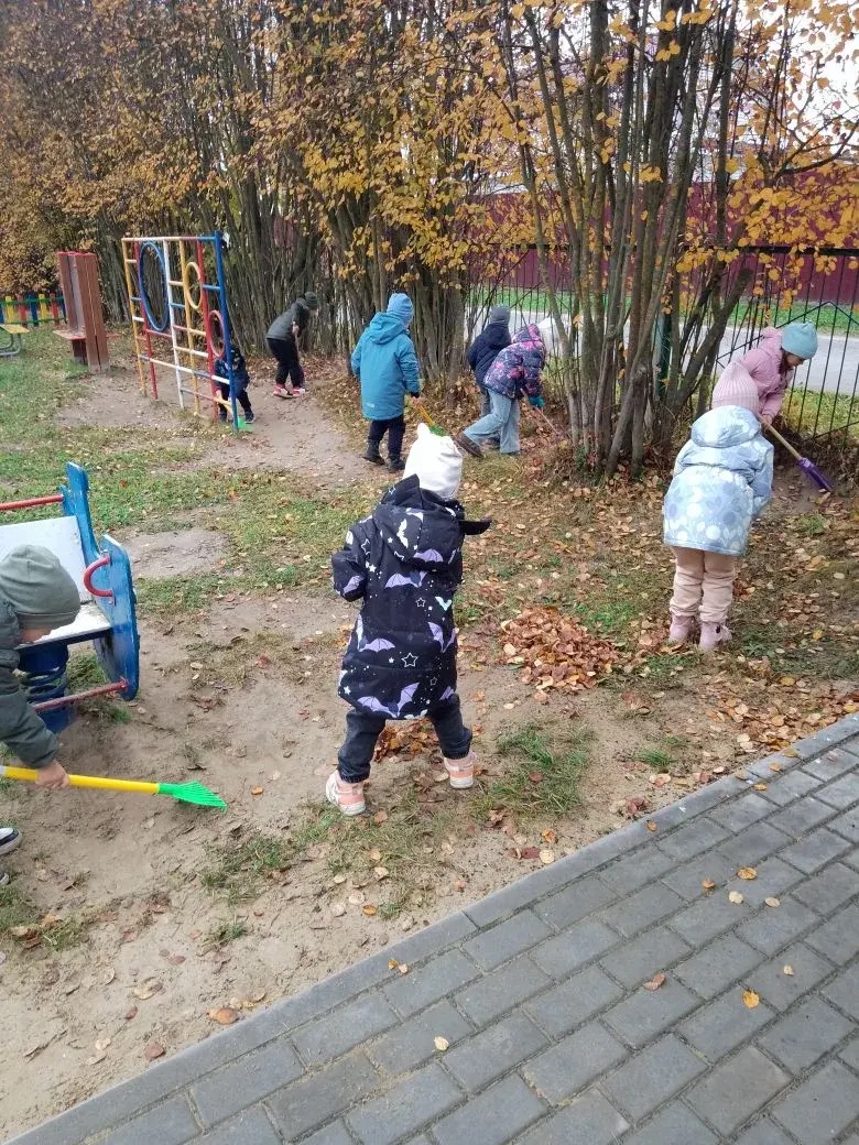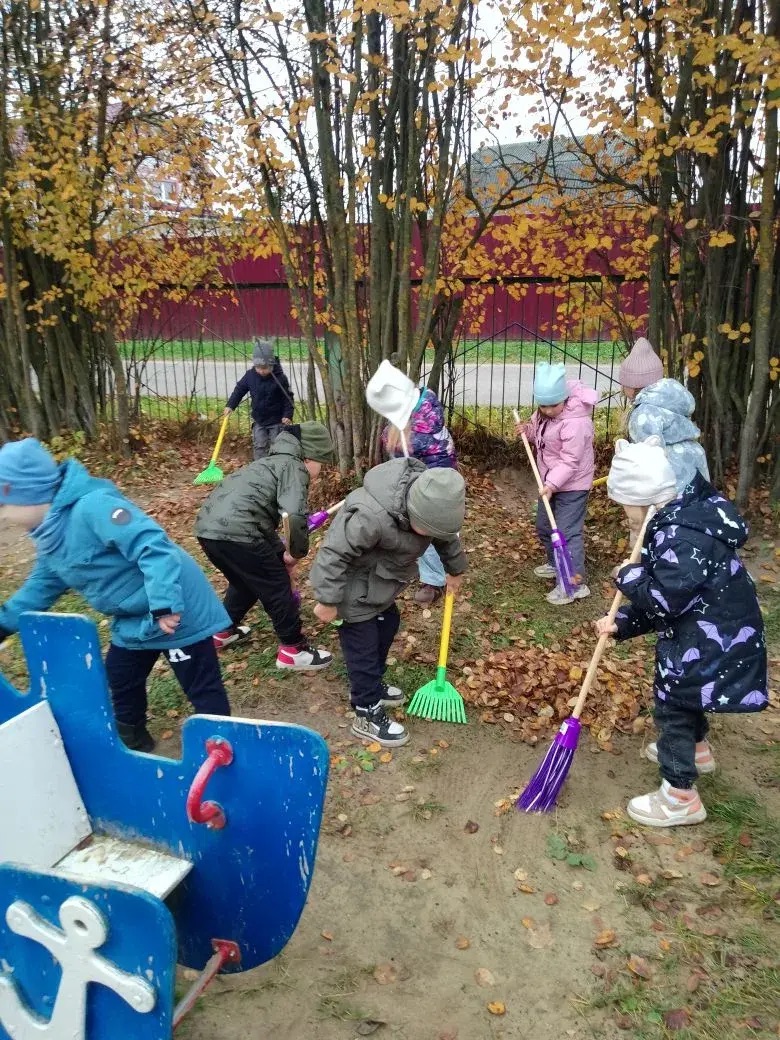 С приходом осени пришла пора уборки листьев. В один из прекрасных осенних дней дети старшей группы "Светофорчик" детского сада №11 "Солнышко" под руководством воспитателя Натальи Руфимовны Лобачевой устроили уборку листвы на своём участке. С большим удовольствием дети помогали собирать листья в кучи граблями и убирать их в мешки для мусора, ведь благодаря этому ребята могли почувствовать себя сильными и самостоятельными, как взрослые.