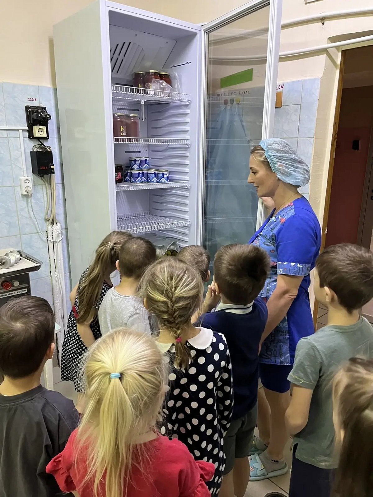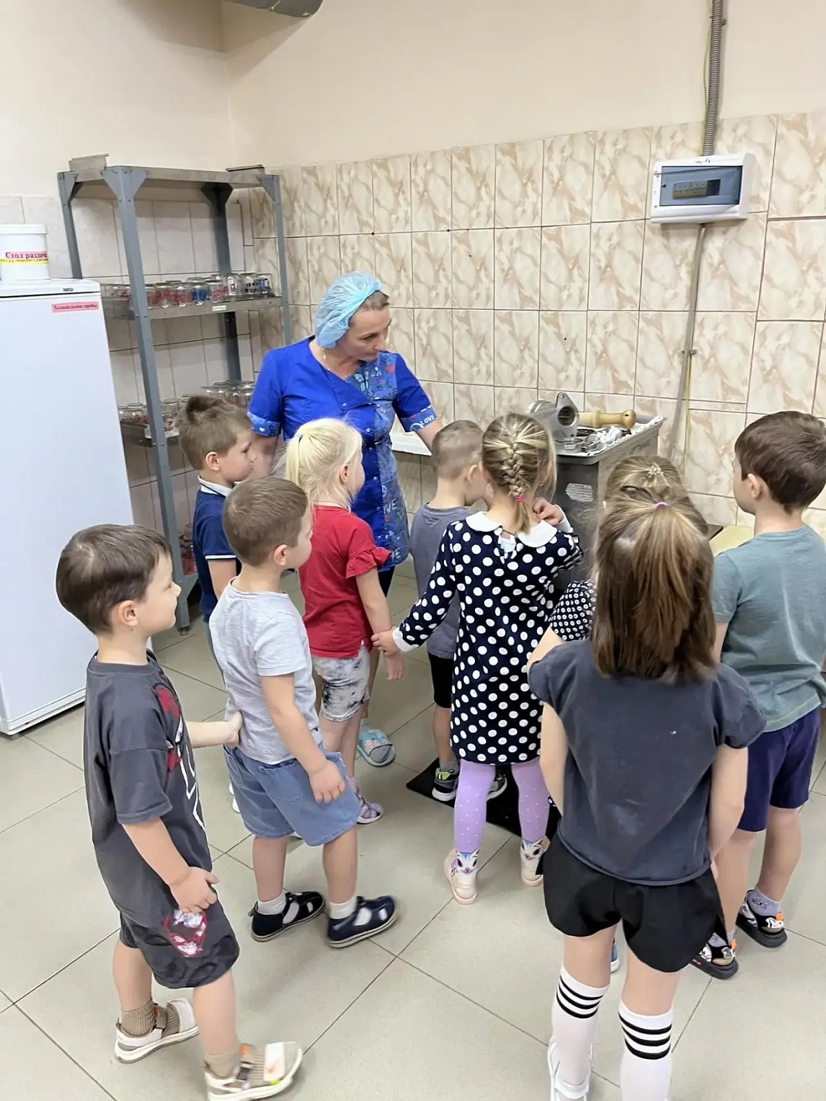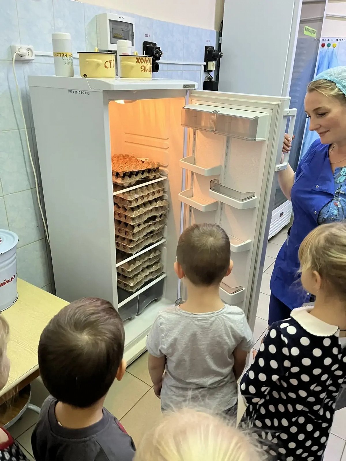 Ребята группы «Звёздочки» с воспитателем Титовой Е. А. посетили пищеблок. Шеф-повар - Елена Сергеевна радушно встретила ребят и провела экскурсию по пищеблоку. Она рассказала как готовят еду, какие продукты используют для приготовления, в какой посуде варят суп, кашу. Показала работу кухонных «помощников»: мясорубки, овощерезки, картофелечистки. Елена Сергеевна обратила внимание на холодильники для хранения молочных продуктов, яиц, консервов. Провела ребят на склады, где находятся продукты и овощи.