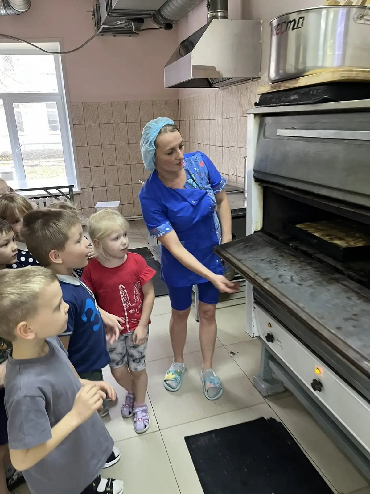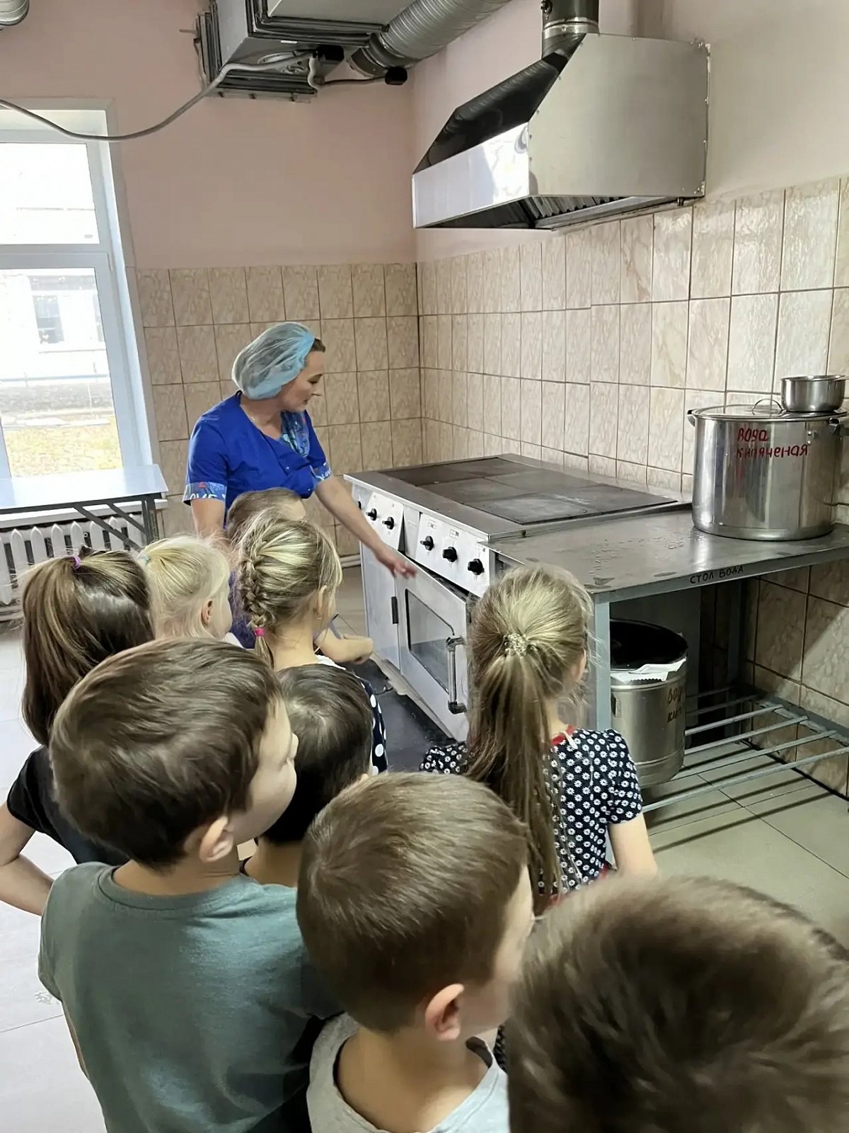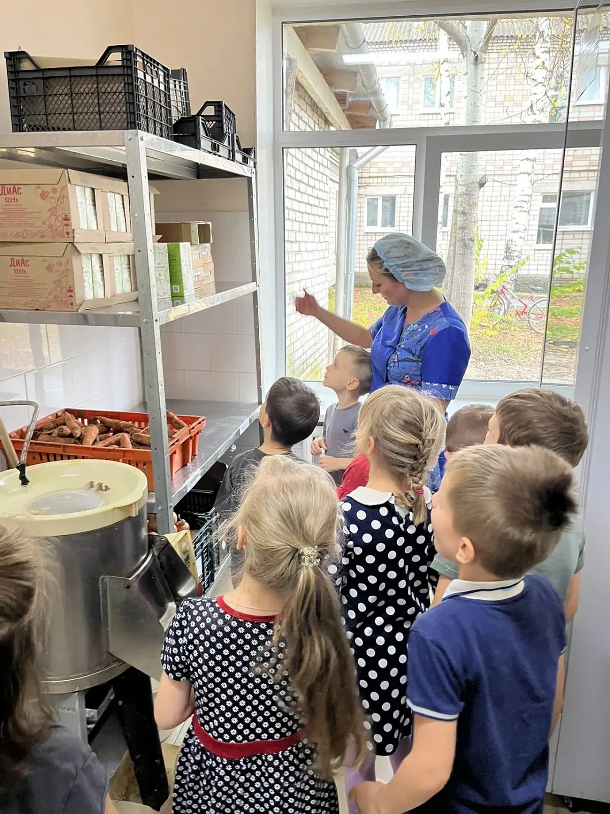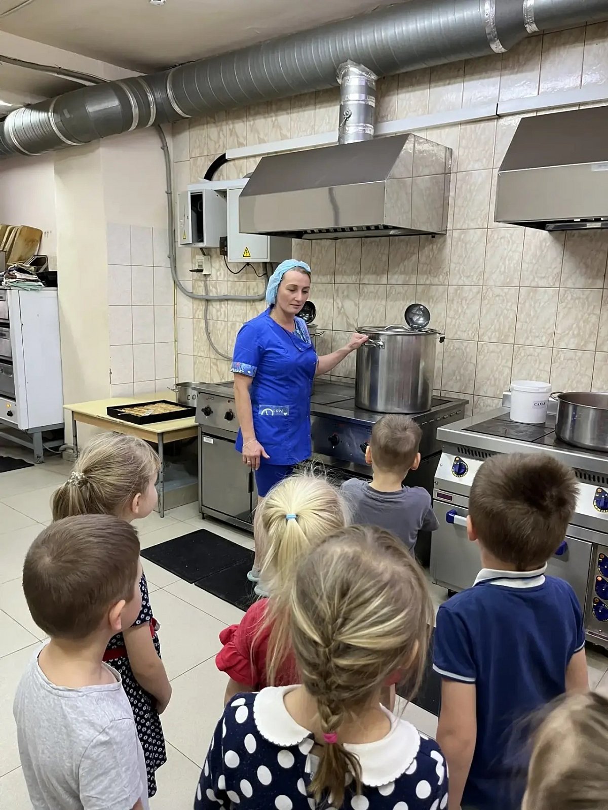 Ребята группы «Звёздочки» с воспитателем Титовой Е. А. посетили пищеблок. Шеф-повар - Елена Сергеевна радушно встретила ребят и провела экскурсию по пищеблоку. Она рассказала как готовят еду, какие продукты используют для приготовления, в какой посуде варят суп, кашу. Показала работу кухонных «помощников»: мясорубки, овощерезки, картофелечистки. Елена Сергеевна обратила внимание на холодильники для хранения молочных продуктов, яиц, консервов. Провела ребят на склады, где находятся продукты и овощи.