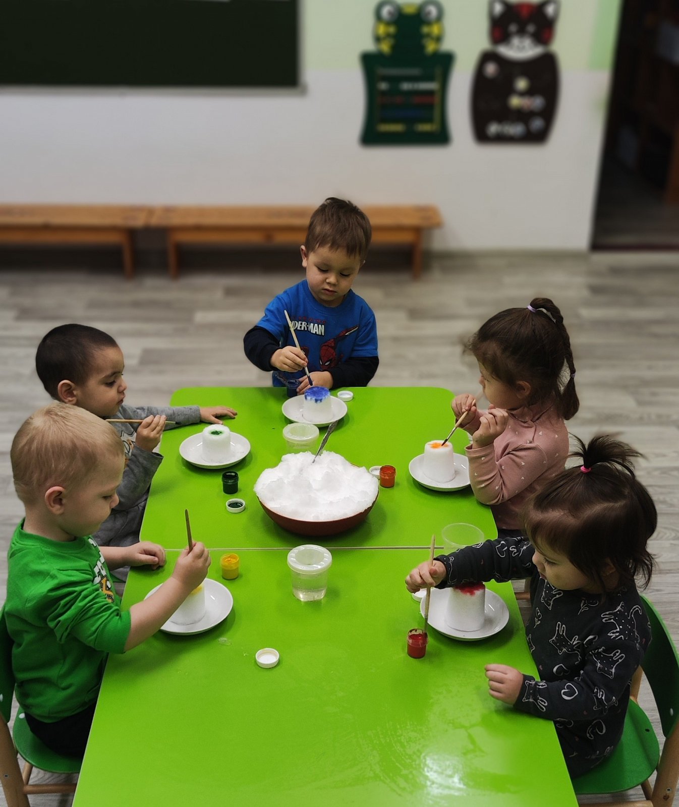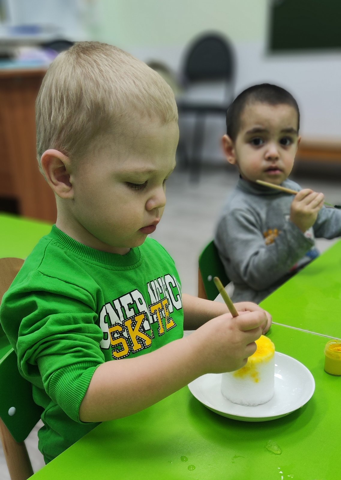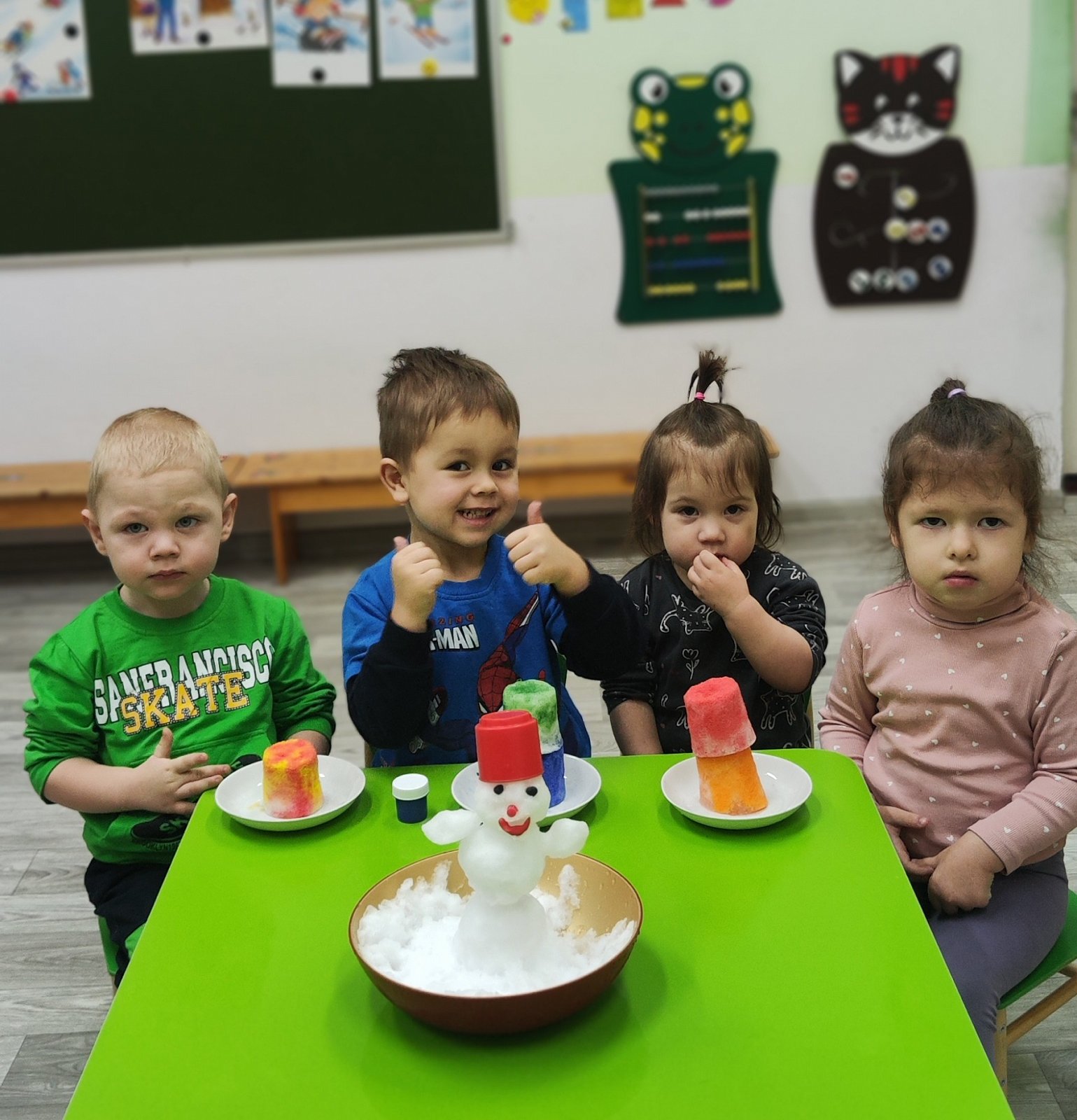 Малыши делали формы из снега и наполняли их красочной водой. Капля за каплей и снег оживал красками!